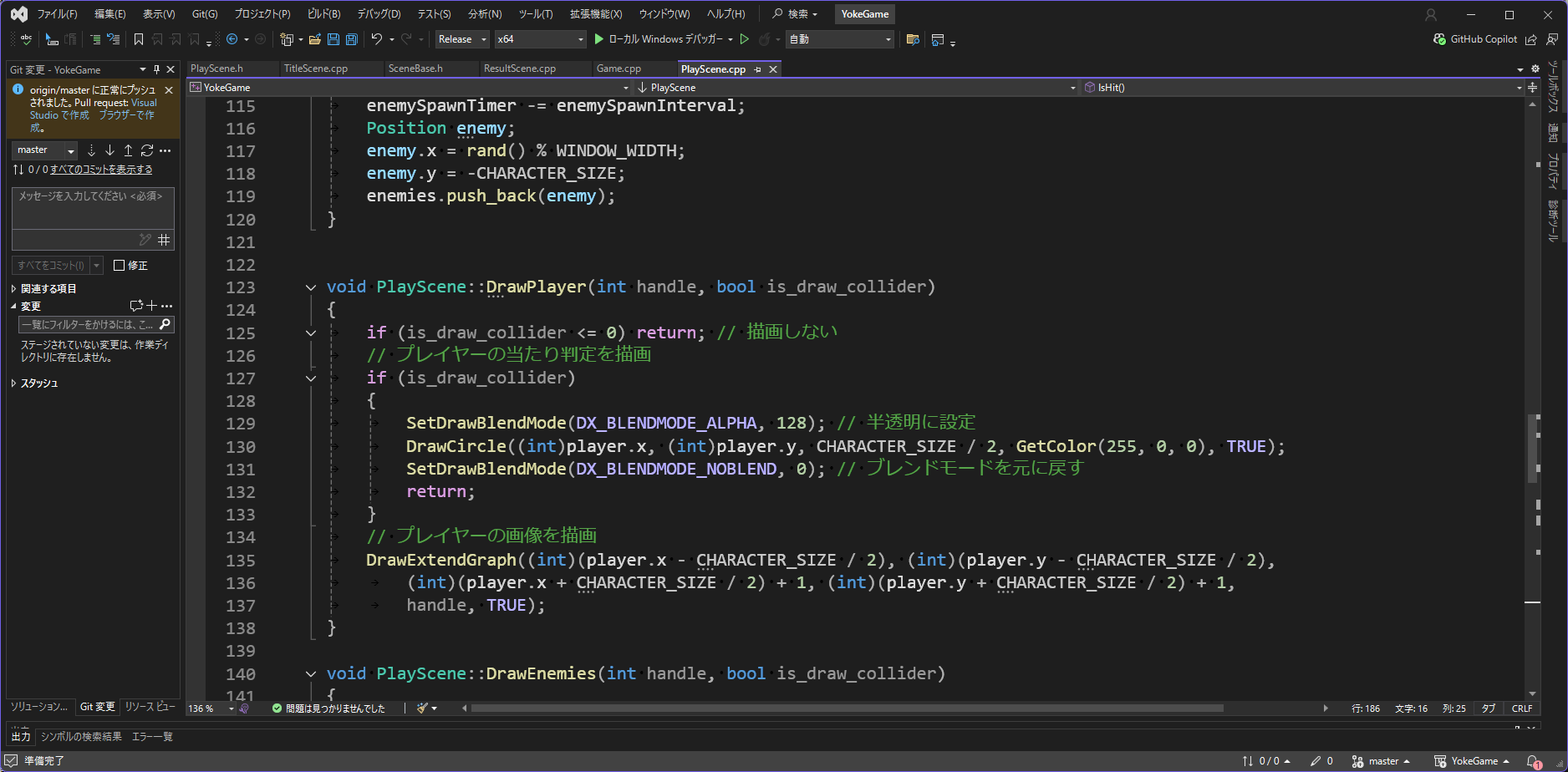 Init()内のLoadGraph呼び出しを上記のように書き換える。- ビルド & 実行してプレイヤーと敵の画像が表示されるか確認。