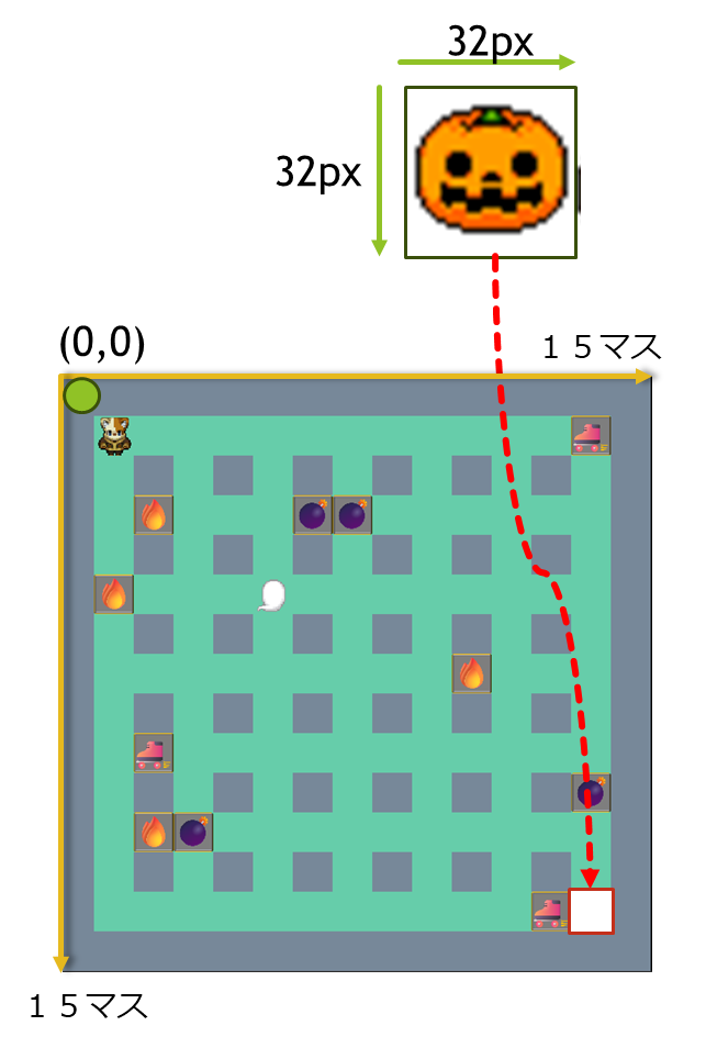 次の目標として、ステージの右下から、ステージの左端まで移動させたい