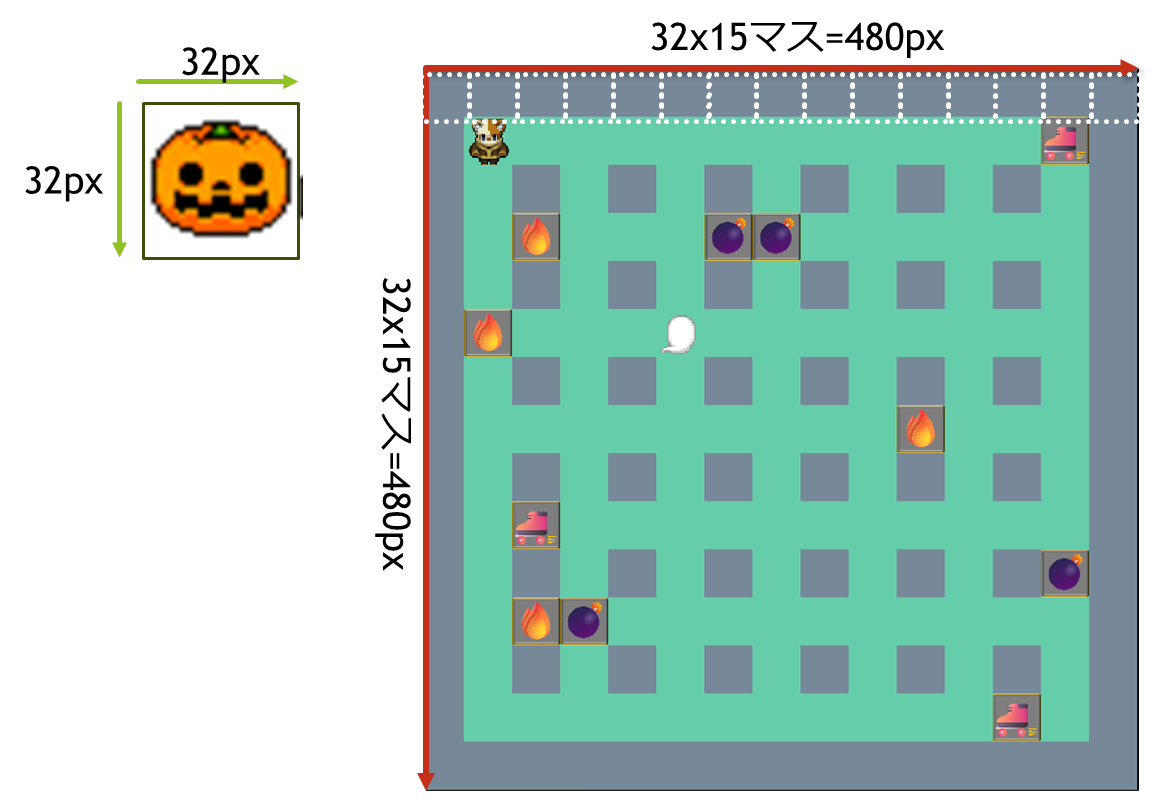 - 実際のx座標 = x方向に何マス目? ✕ キャラ幅