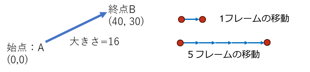 ゲームのキャラクタは、方向を示すベクトルと、スピード、移動時間(フレーム間時間)で、次のフレームの位置を計算します。