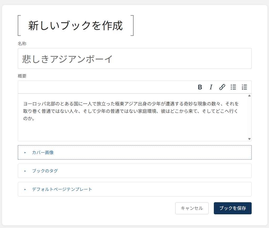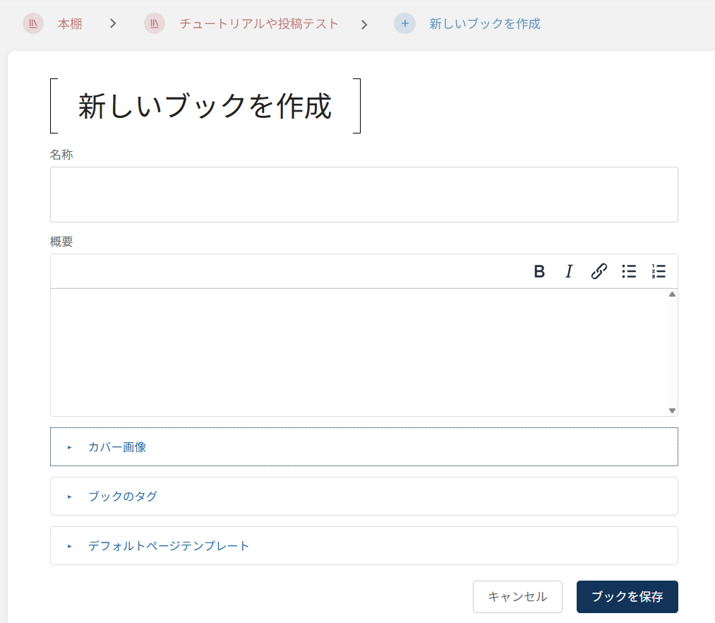 ブック名称、概要、タグを入力して、保存を押したら完了