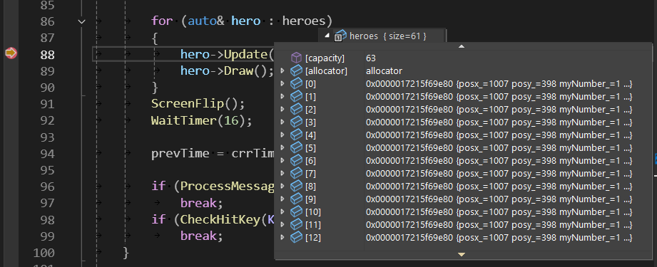 heroes.push_back(p); // ベクターにポインタを追加(シングルトンなら同じアドレスしか入っていかないはず)
