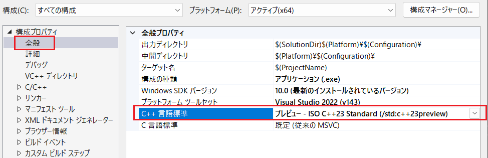 構成プロパティ > 全般 > C++ 言語標準 のプルダウンメニューから、ISO C++23 Standardを選ぶ