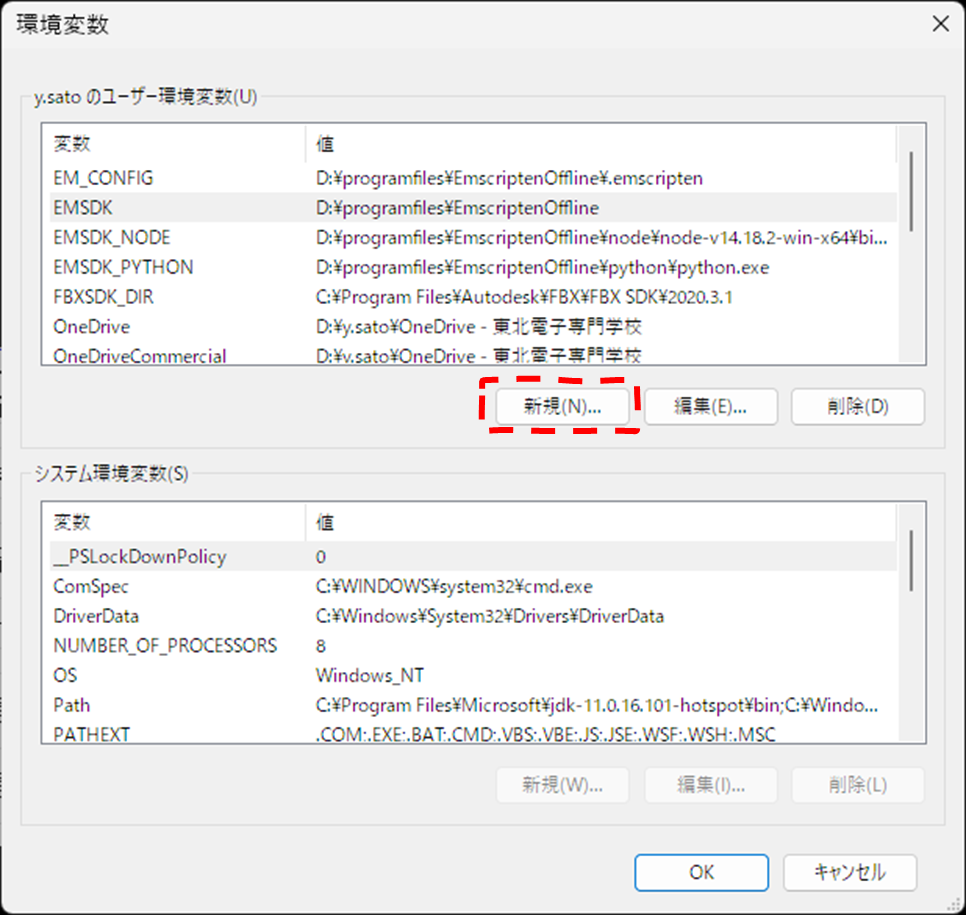 - 「ユーザー環境変数」または「システム環境変数」の欄で 新規 を押す