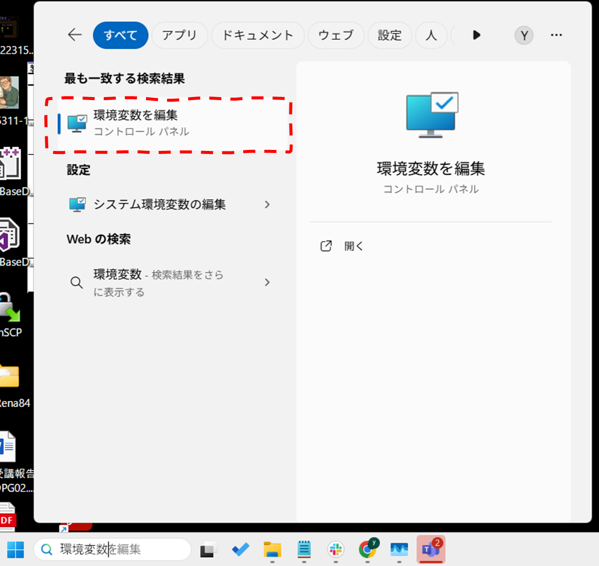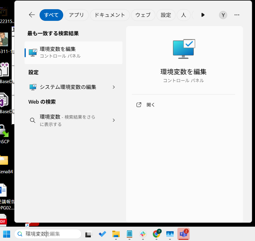 - スタートメニューで「環境変数」と検索 → 「システム環境変数の編集」を開く
